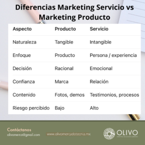 Si buscamos estrategias exitosas en nuestros proyectos, es importante tomar en cuenta estas diferencias; pues el servicio es algo intangible, tomando el papel importante las habilidades y desempeño de la persona, las relaciones, los testimonios y aquí el riesgo es alto; ya que el trato directo con personas es muy variable y depende totalmente de la experiencia percibida; por lo tanto la decisión de compra es más emocional.