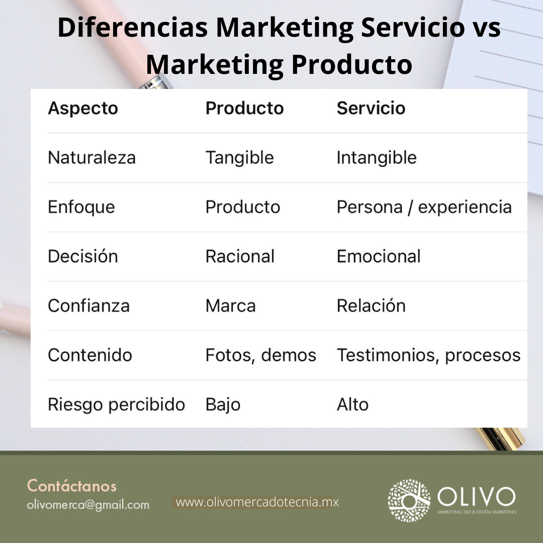 Si buscamos estrategias exitosas en nuestros proyectos, es importante tomar en cuenta estas diferencias; pues el servicio es algo intangible, tomando el papel importante las habilidades y desempeño de la persona, las relaciones, los testimonios y aquí el riesgo es alto; ya que el trato directo con personas es muy variable y depende totalmente de la experiencia percibida; por lo tanto la decisión de compra es más emocional.